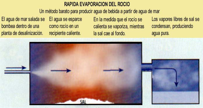 Una empresa americana ha comunicado una interesante nueva tecnología, que permite desalinizar el agua de mar a bajo costo. Ella ha sido desarrollada por la empresa AquaSonic International con sede en Atlanta Georgia y la han denominado "evaporación por rocío rápido (Rapad Spray Evaporation o RSE). Ya han fabricado unidades pórtátiles capaces de desalinizar 11.000 litros de agua por día. Esperan próximamente llegar a construir grandes plantas de salinización.